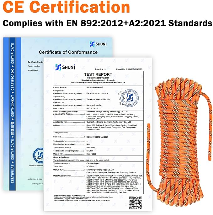 - CE Certified: Our static climbing rope meets the CE Certification of EN 892:2012+A2:2021 Standards (Certificate No. : SHUN2504214880SC), ensuring quality control. UV-Resistant & Abrasion-Proof give the rope a longer service life.