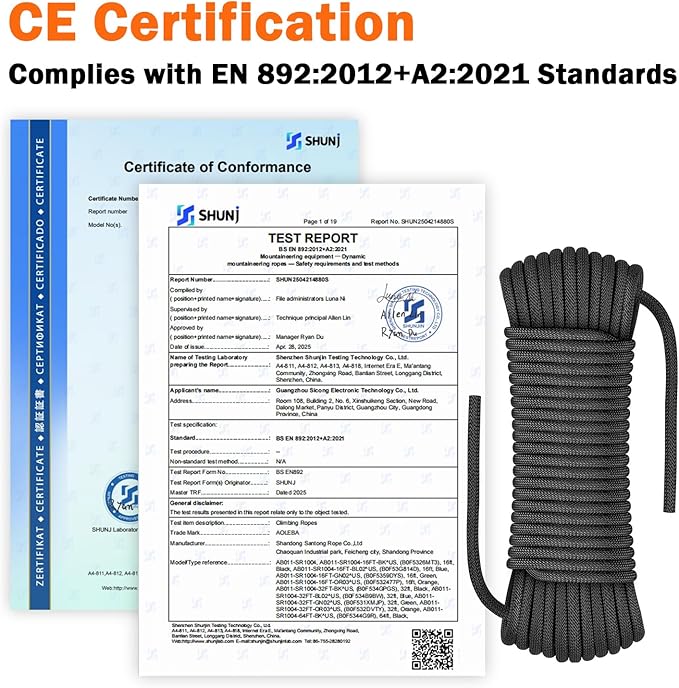 • CE Certified: Our static climbing rope meets the CE Certification of EN 892:2012+A2:2021 Standards (Certificate No. : SHUN2504214880SC), ensuring quality control. UV-Resistant & Abrasion-Proof give the rope a longer service life.