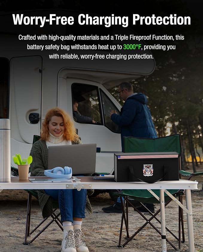 - 【Worry-Free Charging & Travel Safe】Waterproof, dustproof, and radiation-shielded to extend battery life. Fire-resistant inner lining prevents battery combustion during chargins. Ideal for air travel and perfect for camping, RVs, and home storage