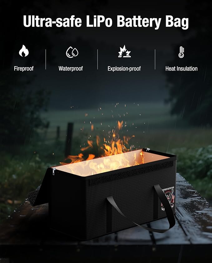 - 【Fireproof & Explosion-Proof Safety】Crafted from fireproof fiberglass, liquid silicone, and non-woven insulation, our lipo battery bag withstands extreme heat up to 3000°F—ensuring safe charging, storage, and transport for lithium-ion/LiFePO4 batteries. Prevents explosions, fires, and thermal runaway, while also protecting valuables like documents, jewelry, and electronics
