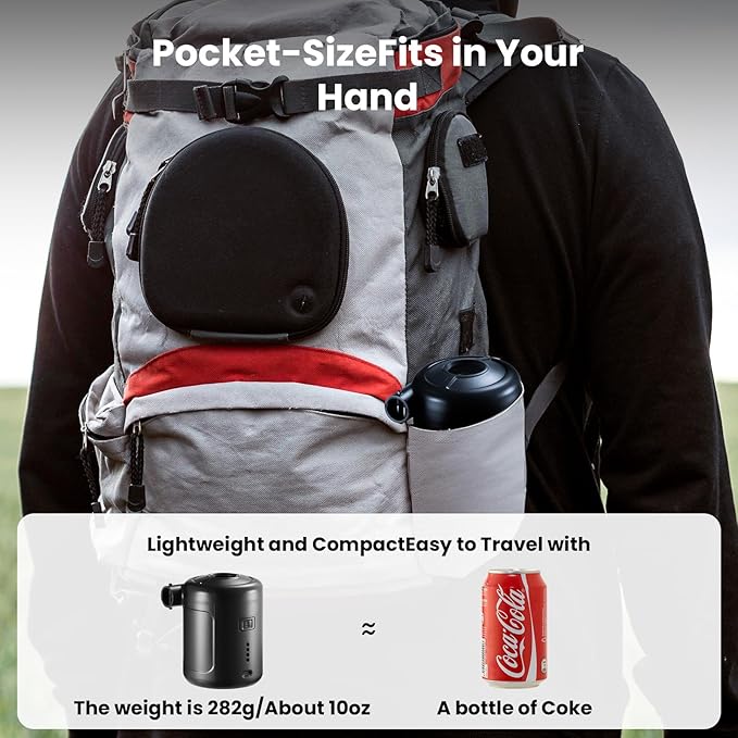 - Ultra-Portable & Wireless Handheld Design: Enjoy ultimate freedom with this compact, lightweight portable inflator air pump. Its ergonomic, handheld design easily clips to backpacks or fits in pockets for effortless transport. Simple one-button operation makes it perfect for beach trips, camping, hiking, or quick home storage (Note: Long press to activate). The essential portable air pump for spontaneous adventures