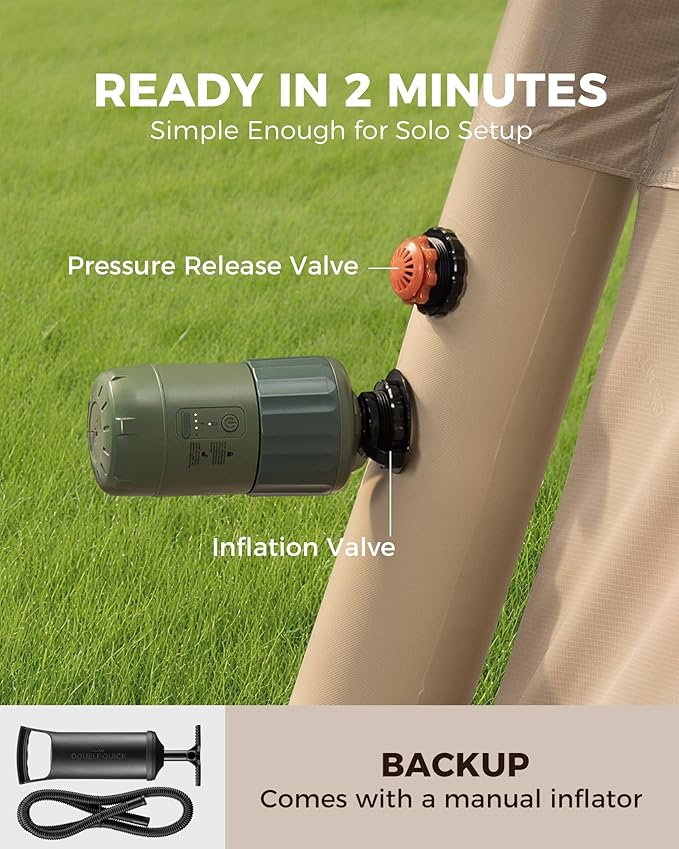 - 2-Minute Setup: Trakiom tents for camping includes both an automatic and a manual pump for quick inflation. Set up in just 2 minutes—easy enough for one person or even a child to assemble independently.
