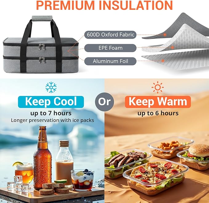 - 【Multi-Purpose and Travel-Ready】With its lightweight design and large capacity, this insulated bag is perfect for transport to potluck parties, BBQs, tailgates, and cookouts. Use it as an insulated cooler for cold desserts or a thermal bag for warm dishes—it’s built for any occasion.