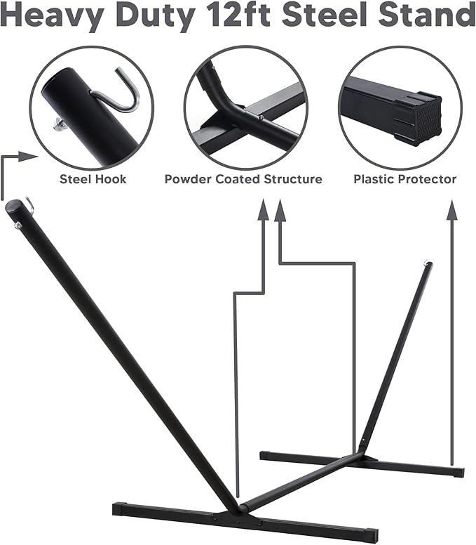 - Freestanding Hammock with Portable Stand: No damage to trees. Created to be stable and long-lasting, the 12 ft stand is made from powder-coated heavy gauge steel. It can be easily assembled in minutes without any tools, and it could be disassembled easily, making it to be a portable hammock. Feel free to contact us if you have any questions during use within one year of purchase. We are always here to help