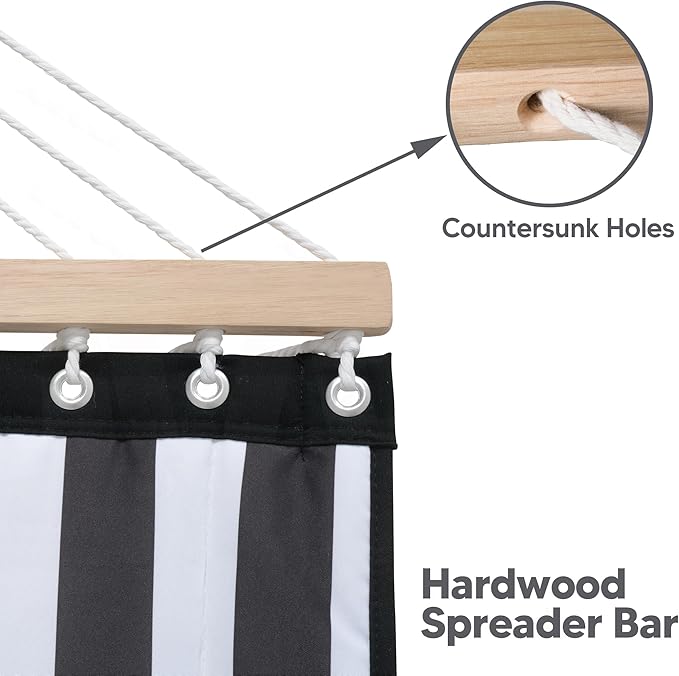 - Hardwood Spreader Bar: 55 inch hardwood spreader bars are more stylish and stable, offering you a comfy nap without the anxiety of falling down. It features countersunk spreader bar holes that reduces the friction between rope and wood