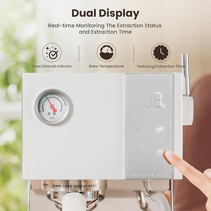 - šš®šš„ šš¢š¬š©š„šš² šššš„-šš¢š¦š ššØš§š¢ššØš«š¢š§š : The Gevi espresso machine features an intuitive touch control panel that makes it easy to customize your brewing settings. Equipped with an extraction pressure gauge and digital display screen, it allows real-time monitoring of extraction pressure, time, and temperature, making the coffee-making process more intuitive.