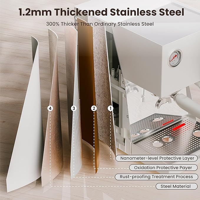 - šš”š¢šš¤šš§šš šššš¢š§š„šš¬š¬ ššššš„ ššØš®š¬š¢š§š : This espresso machine features a thickened stainless steel exterior, which is 300% thicker than ordinary stainless steel materials. Featuring four layers: the Steel Material, Rust-proofing Treatment Process, Oxidation Protective Layer, and Nanoscale Protective Layer. Making it more durable and longer-lasting, and also easier to clean.
