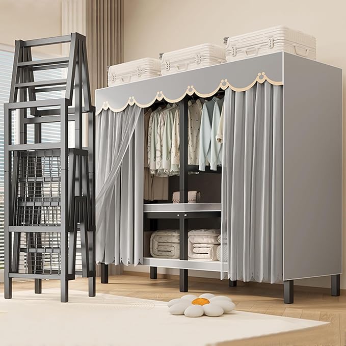 FPIGSHS Heavy Duty Clothes Rack with Cover 2000LBS Foldable Portable Wardrobe Closet for Hanging Clothing Rolling Garment Rack on Wheels for Bedroom Closet System (D(Gauze Curtain Cover, 49.2in)