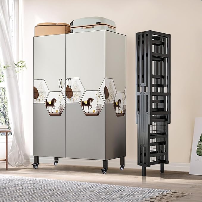 FPIGSHS Heavy Duty Clothes Rack with Magnetic Door 2000LBS Foldable Portable Wardrobe Closet for Hanging Clothing Rolling Garment Rack on Wheels for Bedroom Closet System (C(Pattern Door, 41.3in)