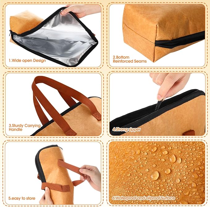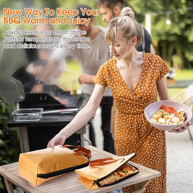- Five Layer Insulation: this reusable bbq resting bag uses an advanced five layer insulation structure to help maintain the ideal temperature of grilled food and allow the meat to reabsorb moisture during resting, keeping it tender and juicy; Made of durable paper, non-woven fabric, leak proof PE lining, thickened insulation sponge, thickened aluminum foil
