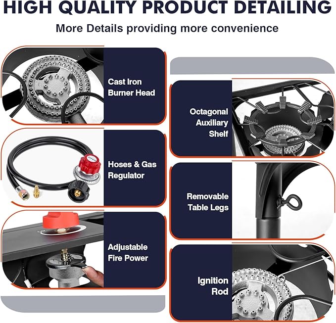 - 🌶Powerful Heat Output - Equipped with three independent burners with a total output of 225,000 BTUs (75,000 BTUs each), it easily handles a wide range of cooking needs such as family dinners, deep frying fish and steaming crabs. Whether you're cooking soup or stir-frying, you can meet the high temperature requirements.