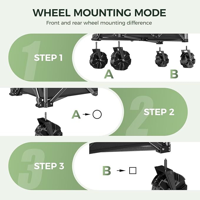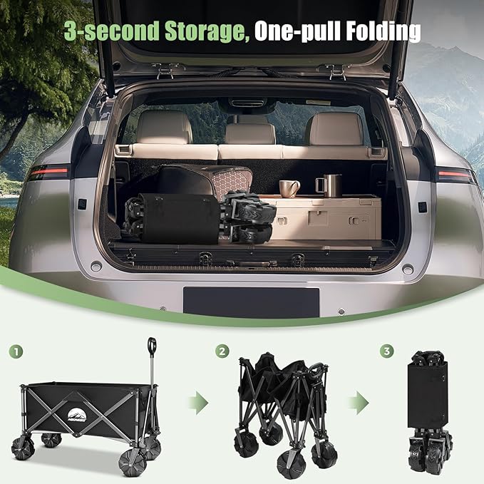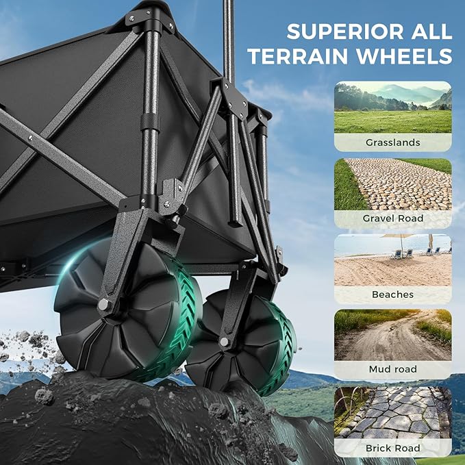 - All-terrain wheels for smooth transportation: The all-terrain wheels of the collapsible heavy-duty wagon with wheels with double bearings roll smoothly and easily on a variety of surfaces including sand, grass and soil. The collapsible wagon with wheels features a 360° swivel front wheel design for easy and convenient pushing and pulling.