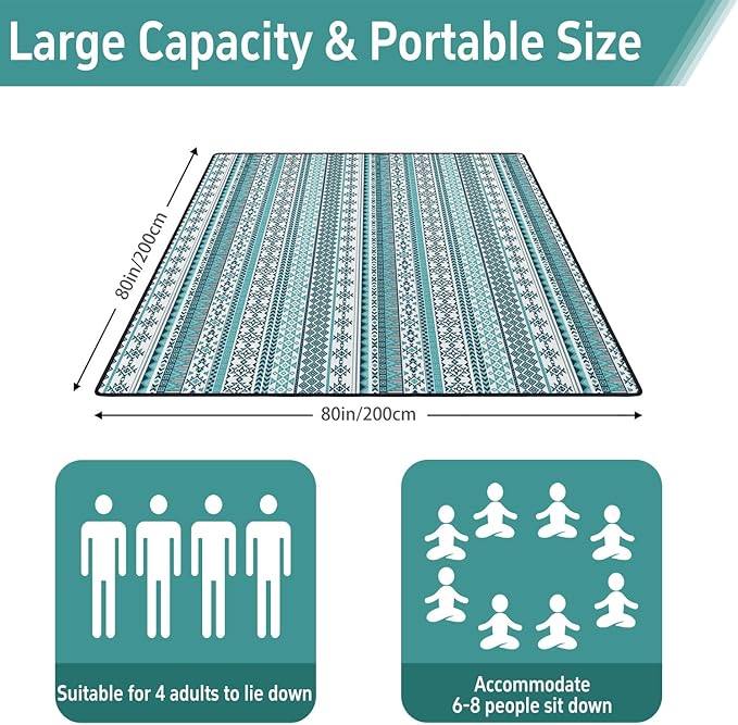 - Extra-Large Size: The Picnic outdoor blanket measures 80x80 inches, providing ample space for 4-8 adults, making it perfect for family gatherings, picnics, or relaxing with friends and pets.