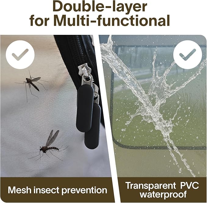 - All-Weather Ready: Built for all four seasons, this pop up tent shields you from rain, wind, and insects. Use the mosquito-proof mesh for breezy backyard lounging or rely on the waterproof PVC layer for storm protection—versatility meets durability. And the built-in fabric side doubles as a sunshade sail—no extra purchase needed! Block sunlight, prevent sunburn, and enjoy added privacy.