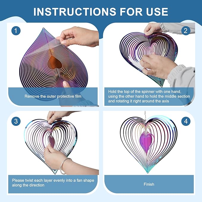 - 【Heart Wind Spinners Outdoor】By laser-cutting technology to form large heart shape, it's material with strong corrosion resistance, wear resistance, reflective and rust resistance. This heart strands of wind spinner for outside includes 1pcs double-sided mirror wind turntables, 360-degree rotating hooks and love pendant. 16.5 inch in total long with the love crystal pendent.It makes it visible even from a distance. Notice: Protective plastic film adheres to both sides of the heart, which needs to be peeled off before expanding the fishbone into 3D form