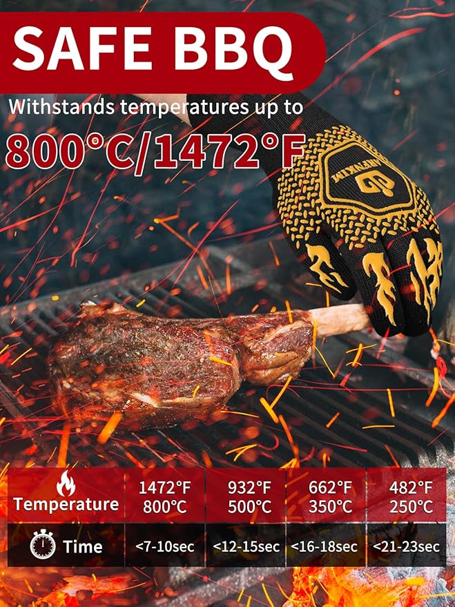 - Unmatched Heat Resistance: Our BBQ oven gloves are designed to 1472°F (800°C) withstand extreme heat, ensuring safe handling of hot grills, pans, and oven trays. Perfect for all your high-temperature cooking needs.