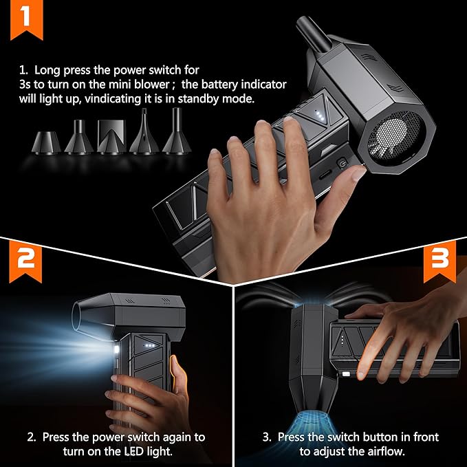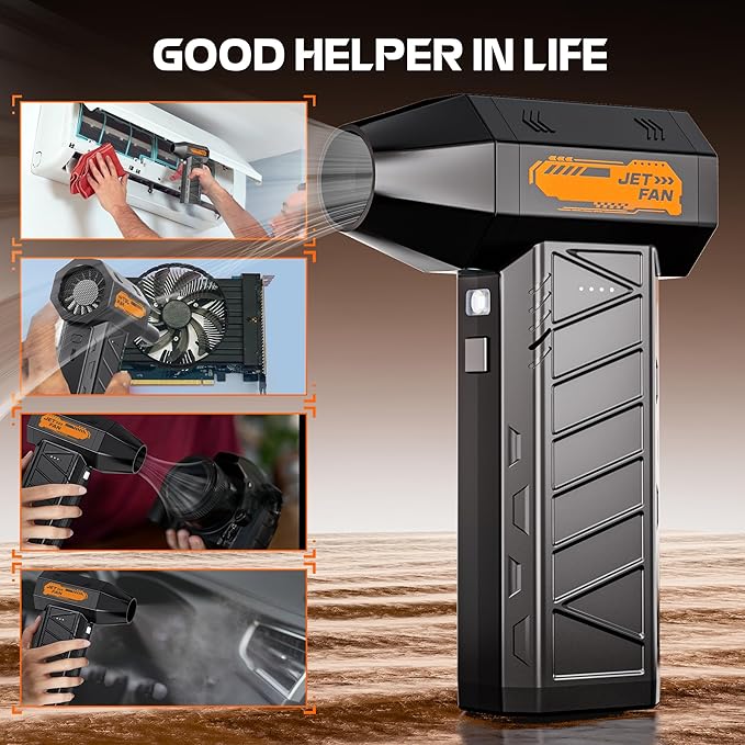 - Versatile Cleaning Tool and Convenient Storage: Featuring 5 nozzles the turbo jet fan is perfect for cleaning electronics like PCs, as well as for home, Leaves, car, and outdoor use. It’s also great for inflating gear or managing campfires, making it a must-have for multiple scenarios. The included storage bag keeps everything organized and portable