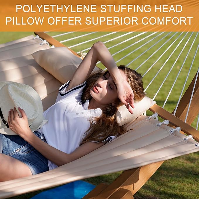 - SUPER COMFY: The double-layered quilted polyester with inner polyester padding and a polyethylene stuffing head pillow offer superior comfort. This quilted hammock can give you a cloud-like comfortable experience. Lying on it is like being in a warm embrace. No matter it's in summer or winter, this hammock will always be your first choice for relaxation
