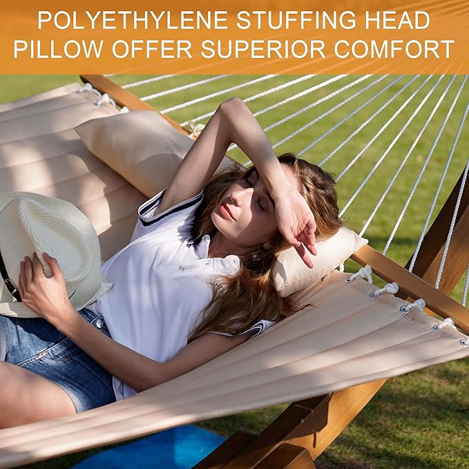 - SUPER COMFY: The double-layered quilted polyester with inner polyester padding and a polyethylene stuffing head pillow offer superior comfort. This quilted hammock can give you a cloud-like comfortable experience. Lying on it is like being in a warm embrace. No matter it's in summer or winter, this hammock will always be your first choice for relaxation