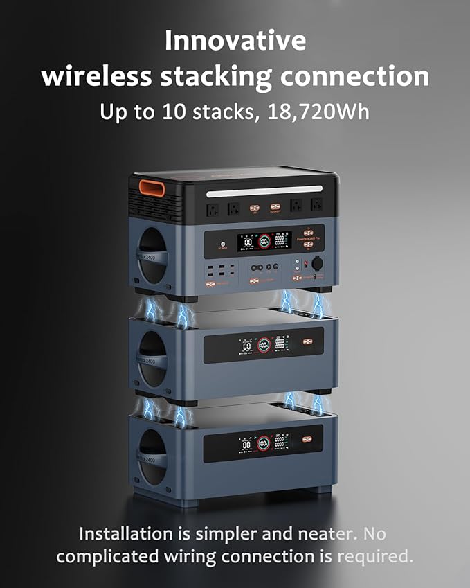 - [Upgraded Stacking Design -Expandable Capacity] - Powermax 2400 solar powered generator supports up to 10 BP2400 battery packs (1872Wh each), allowing an impressive overall capacity of 20592Wh, ensuring uninterrupted power for your essentials during outages.