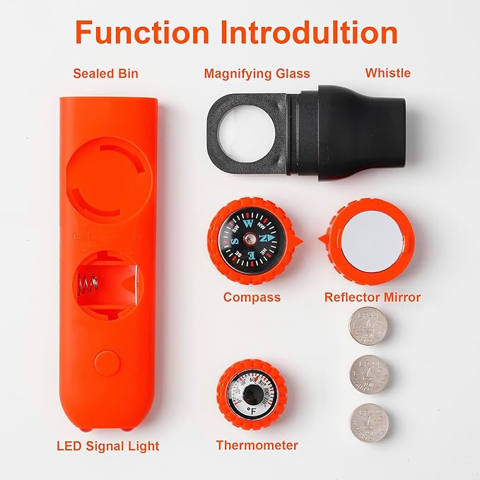 - The 7-in-1 Safety Whistle sets 7 functions including Emergency Whistle, Compass, Thermometer, LED Signal Light, Magnifying Glass, Reflector and Sealed Warehouse with good playability (The uniquely designed miniature built-in storage bin can be used to store important personal information, allowing rescuers to grasp your situation at the first time) (NOTE: If you need help in an emergency, you can try whistling softly, which is louder than whistling at full force)
