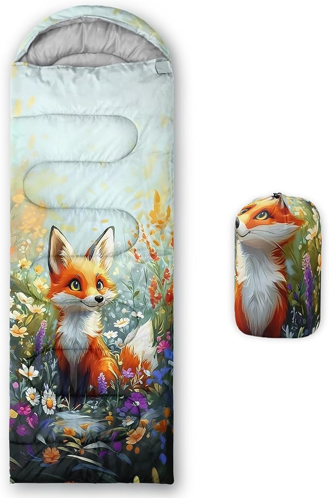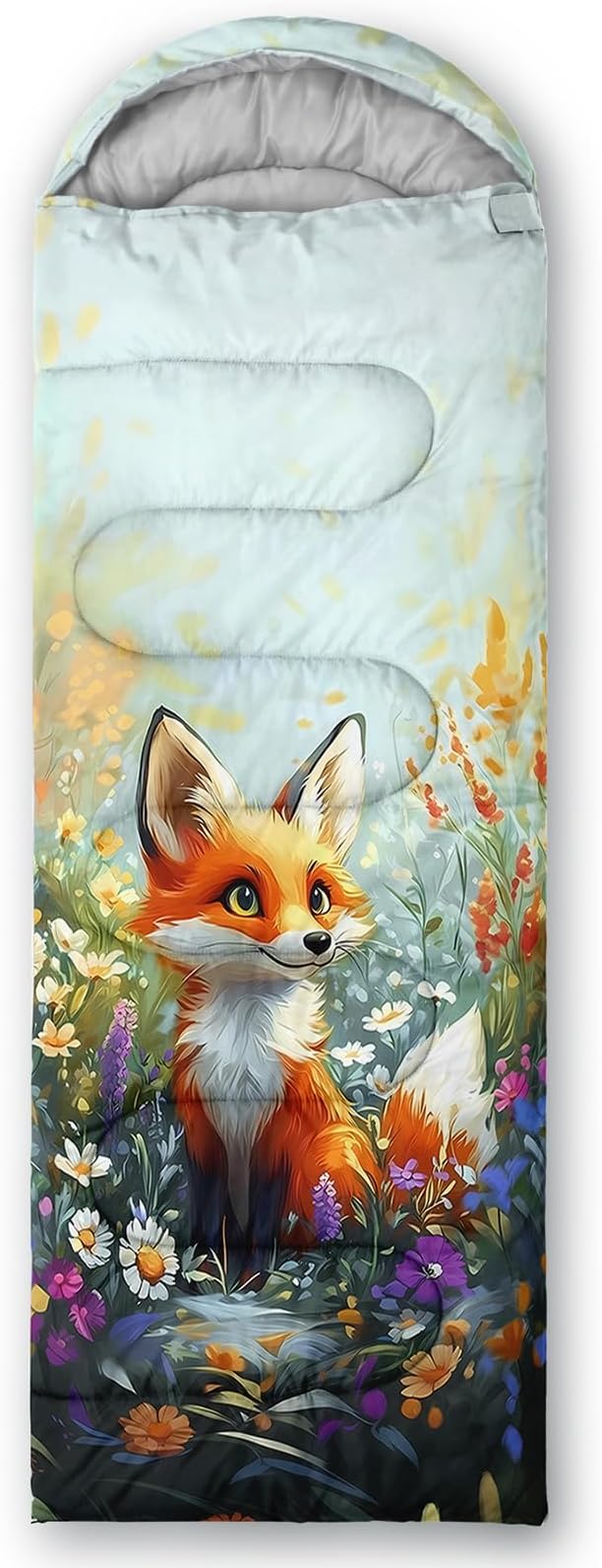 - Unique Fox Design:This Fox pattern sleeping bag is made of 3D digital printing with vibrant colors and patterns,size: 31W x 90L inches,temperature range: 32℉-77℉ (0℃-25℃),it also also have a weather resistant waterproof design to keep you warm and prevent you from any dampness,can be used in 3 seasons