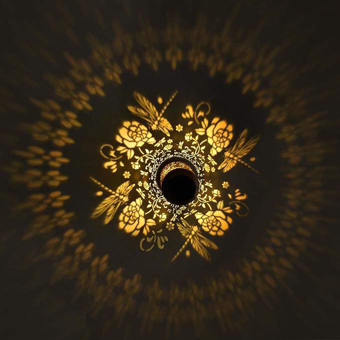- Elegant Dragonfly Design: Add charm and warmth to your garden with this vintage-inspired solar lantern. Featuring a golden copper finish and a hollowed metal design, the lantern casts soft, glowing light with graceful dragonfly patterns, creating a cozy and romantic atmosphere after dark