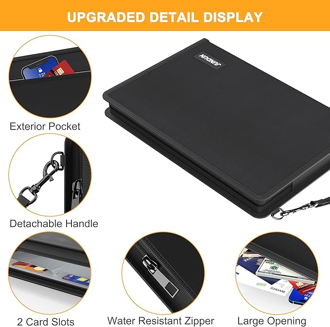 - Comfortable Handle and Additional Exterior Pocket:fireproof bag for documents is equipped with a sturdy handle, making it easy to transport the documents when needed.When you have a lot of things to carry, you can also hang money bag in your hand. So as to free your hands.Additional exterior zipper pocket for fireproof bag for cash can hold keys ,business card ,plane ticket,transit cards ,small notebook and other personal items.You no longer have to worry about losing small items