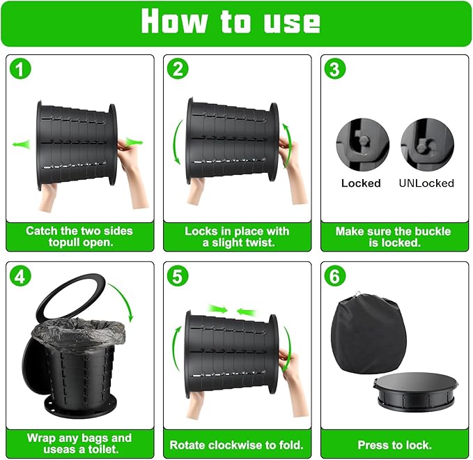 - 🏕️【Quick & Easy Setup】One pull and twist clockwise to start using instantly! Make sure all buckles are locked firmly before sitting. After using porta potty for camping, just rotate counterclockwise and press it to a disk for easy transport. With a lightweight design of just 2.75 lbs, this folding toilet is easy to carry with our handy bag. You can easily place it in backpacks, cars, or RVs.