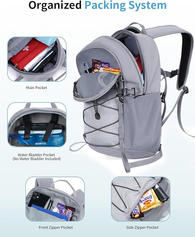 - 【Multiple Compartment】 20L Hiking daypack dimensions: 17.7*10.2*7.9 inches, multi-compartment zipper pocket provides you with plenty of space to store your belongings, 3 zipper pockets and internal small pockets ensures your valuables such as credit cards, phones, keys don't get lost. Main compartment build-in hydration system (no water bladder included), you can also use it as a USB cable exit.