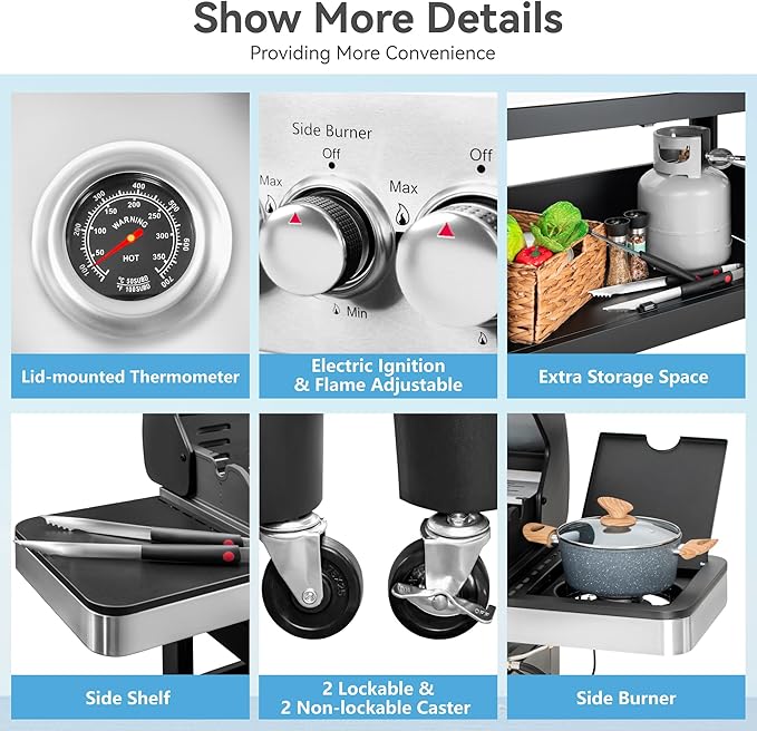 - VERSATILE SIDE BURNER: Our 6 burner gas grill comes equipped with a side burner, providing extra cooking space for sauces and sides. Elevate your outdoor culinary experience with added versatility