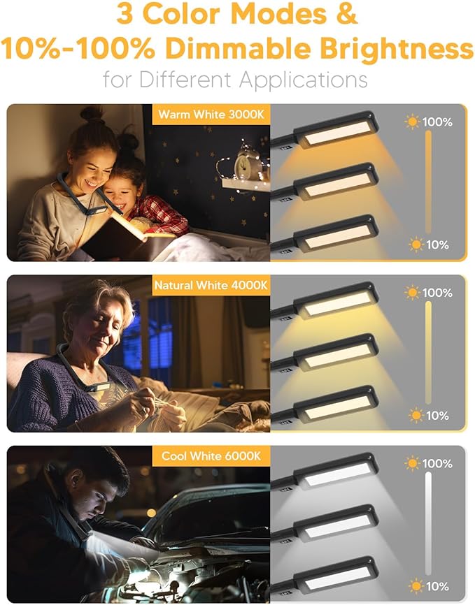 - 3 Color Temperatures & Stepless Dimming from 100% to 10%: This hands-free neck lamp features three color temperature modes: warm white, natural white, and cool white. You can switch modes with a single click. Press and hold the same button to adjust brightness from 100% down to 10%. The flexible arms and patented 180° rotatable light heads allow you to direct the light exactly where you need it. Perfect for detailed nighttime tasks or emergency lighting during power outages