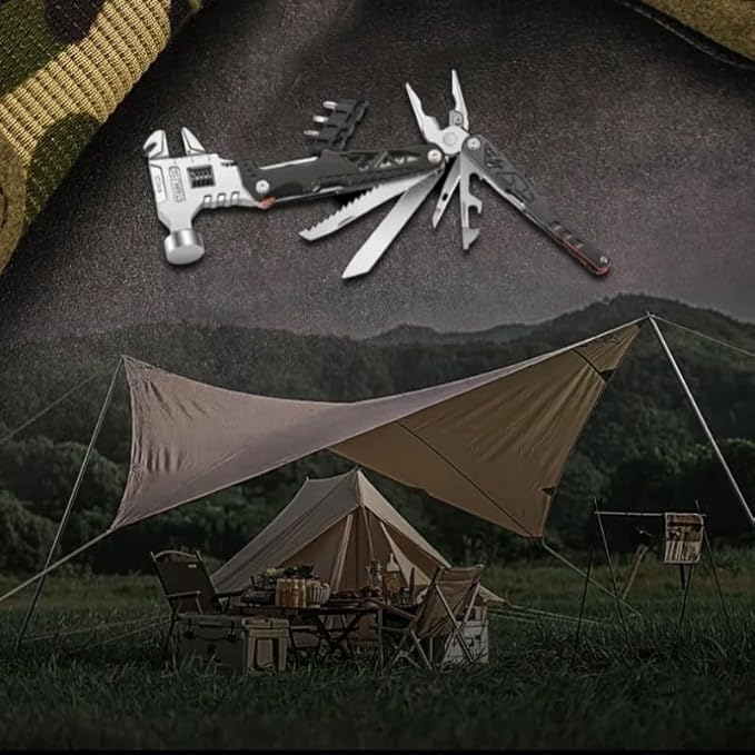 - 18-in-1 Multitool: Includes an adjustable wrench, hammer, nail puller, screwdrivers, wire cutter, pliers, flint rod, safety whistle, bottle opener, can opener, threader, knife, and saw.