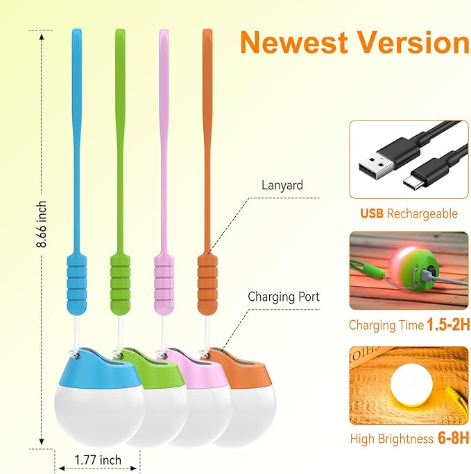 - 4 Light Modes & 150 Lumens High Brightness: Each rechargeable camping lantern features 4 lighting modes—high, medium, red light, and SOS red flash—ideal for any situation. Long-press to switch colors and create the right mood whether you're indoors or out. Powered by 8 upgraded LED beads with 150 lumens of output, this tent light delivers stable, bright light that’s perfect for tents, reading, or emergencies