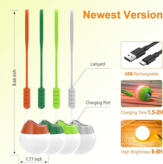 - 4 Light Modes & 150 Lumens High Brightness: Each rechargeable camping lantern features 4 lighting modes—high, medium, red light, and SOS red flash—ideal for any situation. Long-press to switch colors and create the right mood whether you're indoors or out. Powered by 8 upgraded LED beads with 150 lumens of output, this tent light delivers stable, bright light that’s perfect for tents, reading, or emergencies