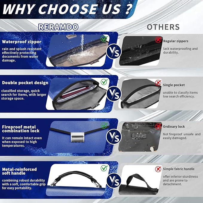 - [TRUSTWORTHY AFTER-SALES SERVICE]RERAMDO is committed to the innovation of fireproof products and providing high quality products and services to our customers. Recommended by professional firefighters to protect your valuables from fire, this fireproof document bag is also perfect as a gift for family and friends. If you have any questions about the product, please feel free to contact us and RERAMDO will do our best to help you.