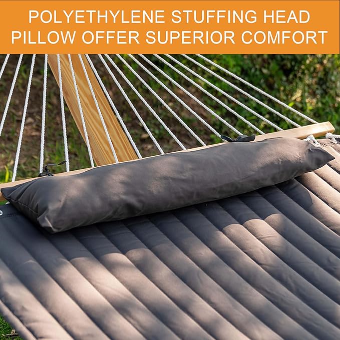 - SUPER COMFY: The double-layered quilted polyester with inner polyester padding and a polyethylene stuffing head pillow offer superior comfort. This quilted hammock can give you a cloud-like comfortable experience. Lying on it is like being in a warm embrace. No matter it's in summer or winter, this hammock will always be your first choice for relaxation