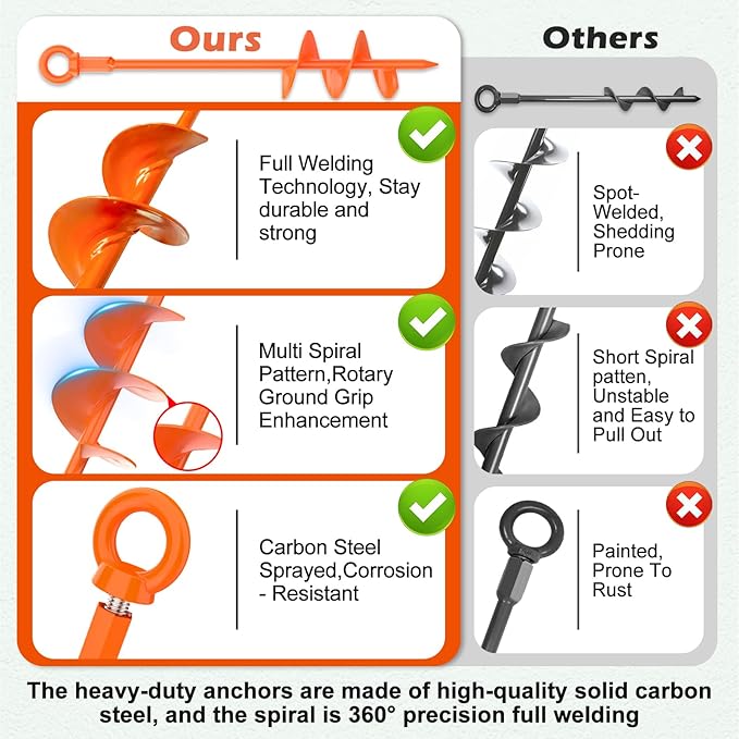 - Quick & Secure Installation: Install easily with included T-handle wrench (soft soil) or impact drill (firm soil). Sharp-tip spiral design with removable heads ensures smooth screwing into the soil, sand and grass. For best results, lightly moisten dry soil before installation