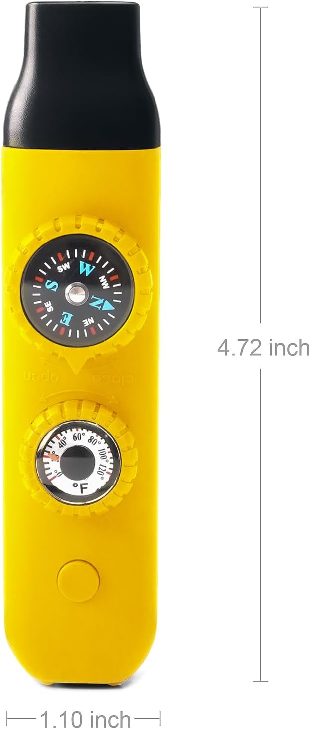 • The 7-in-1 Safety Whistle sets 7 functions including Emergency Whistle, Compass, Thermometer, LED Signal Light, Magnifying Glass, Reflector and Sealed Warehouse with good playability (The uniquely designed miniature built-in storage bin can be used to store important personal information, allowing rescuers to grasp your situation at the first time) (NOTE: If you need help in an emergency, you can try whistling softly, which is louder than whistling at full force)
