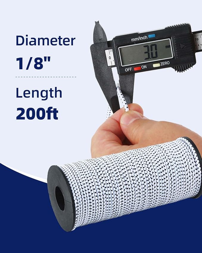 - PREMIUM ELASTIC SHOCK CORD: Made from high-quality latex core wrapped in durable white polyester with a black tracer line for added strength and flexibility. Perfect for stretching, securing, and rebounding
