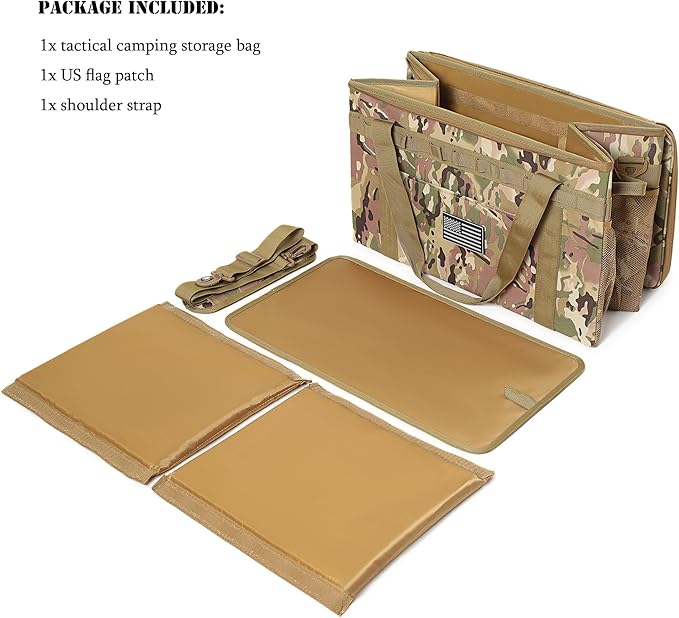 - Package included: 1x tactical camping storage bag, 1x US flag patch, 1x shoulder strap.Full size: 16.9" x 11.8" x 11.8"(folded size: 16.9" x 11.8" x 2.7") with 38L Large capacity.