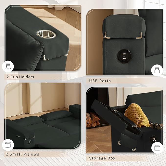 - 【Hidden Side Table & Storage Armrests – Smart Space-Saving Design】Say goodbye to clutter! This sleeper sofa features built-in storage armrests for remotes, books, and more, plus a hidden side table that slides out when you need it. Ideal for small spaces or minimalist setups.