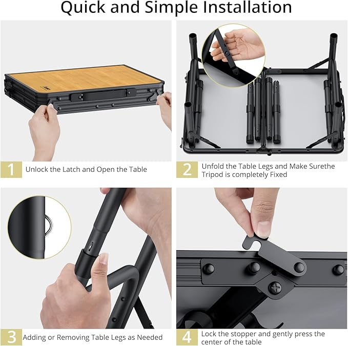 - Portable & Easy to Set Up: Set up within 1 minute and folds up into a briefcase sized package for easy transport and space-saving, great to store in your car, RV, river rafts, motorcycle rear seats. Moreover, this small camping table only weighs 5.7lbs, which can support 66lbs weight limit, and attached a convenient carry handle