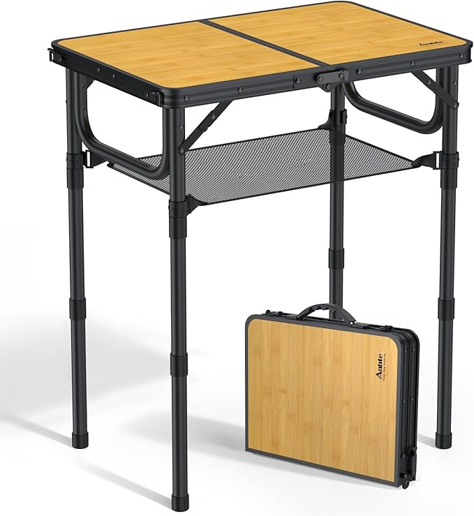 2ft Camping Table Foldable with Storage Net, 3 Adjustable Heights Aluminum Small Folding Table, Lightweight, Portable Handle, for Travel Outdoor Beach Camping Picnic, 23.2" x 16", Yellow