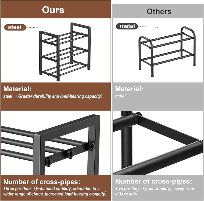 - π Sturdy 3-Tube Design for Enhanced Shoe Storage Features three reinforced middle tubes (vs competitors' two) to securely hold up to more pairs of shoes per tier without sagging. The robust square side tubes + round crossbar structure ensures 150lbs weight capacity β perfect for heavy boots or multiple sneakers!