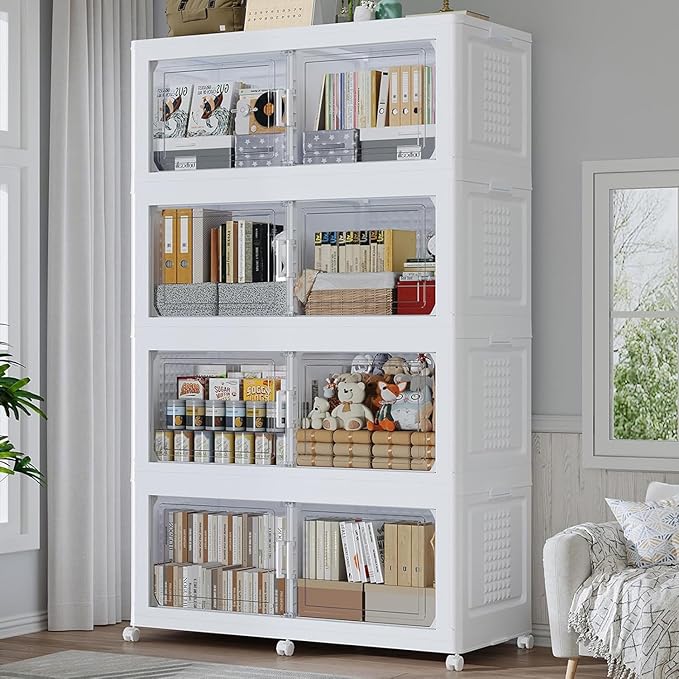 - 【Two Ways to Open & Clear Magnetic Door】The collapsible storage bins with lids and wheels feature a dual access way, allowing for both top and front door openings, and with clear windows for easy visibility. The stackable plastic storage bins with open front doors are equipped with magnetic lock buckles to prevent dust from entering the cabinet.