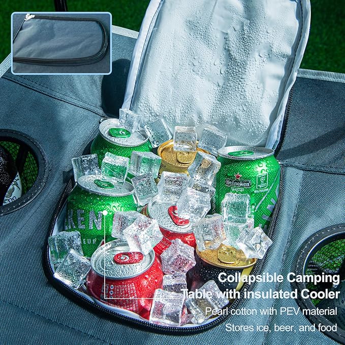 Folding Beach Table, Camping Table for Sand with Insulated Cooler Storage & 4 Cup Holders, Portable Pop Up Picnic Table, Lightweight Side Table for Outdoor