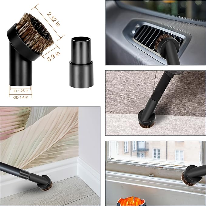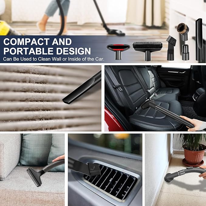 - Wet vac Attachment Kit: Vacuum accessories and attachments include 3×1/2" to 1 1/4" vacuum hose adapter, 1×7/8" to 1 3/8" to 1 1/4 to 1" and 1 3/8" to 1 1/4" vacuum adapter, 1×12" wide vacuum brush attachment, 1×1/4" horsehair vacuum brush, 1×1/4" utility nozzle with removable plastic brush, 1×1/4" brush & nozzle combination tool, 2×17.7long vacuum extension tube.