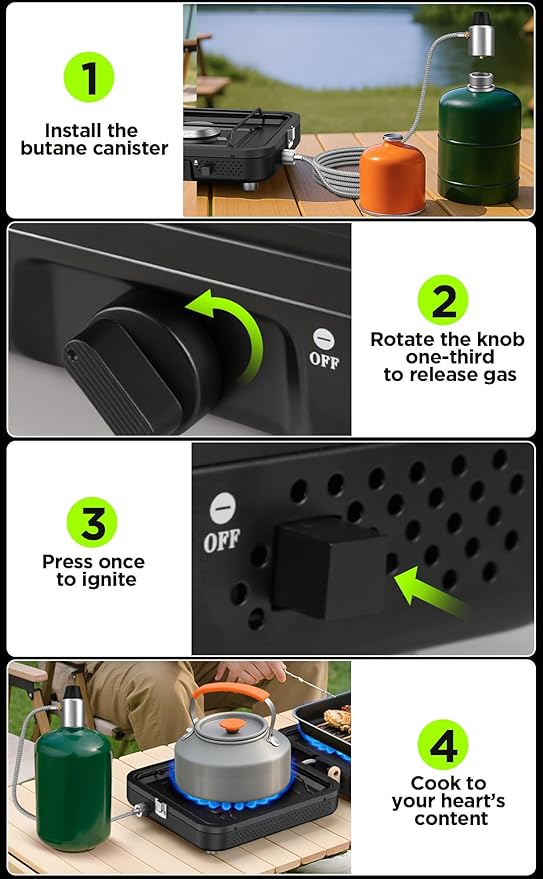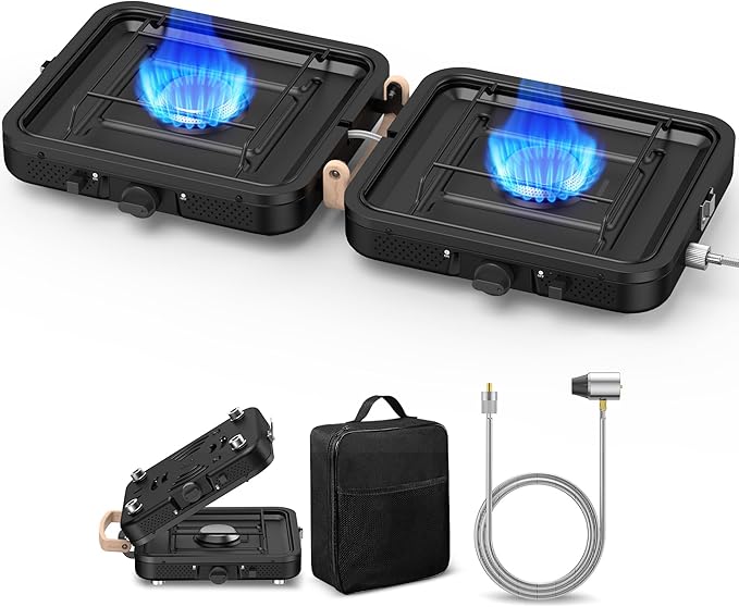 - High Heat Output for Fast Cooking: With a total of 10,000 BTU (5000 BTU/1.465KW per burner), this portable propane stove can boil water in minutes, making it ideal for outdoor cooking, grilling, frying, and even emergency use during power outages.