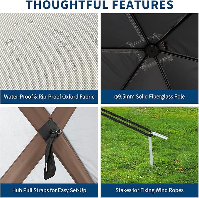 - 10x10FT Spacious Shelter with Protective Materials. Crafted from 250D Oxford fabric and B3 mesh netting for enhanced coverage. Features IPX3 water resistance, UV-blocking canopy, and insect-resistant design – ideal for family camping, backyard gatherings, and outdoor events.